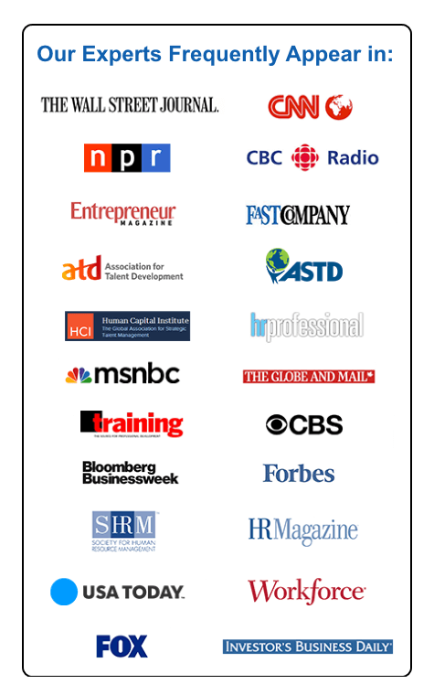 Our Featured Subject Matter Experts get paid tens of thousands of dollars to perform live presentations to organizations around the world. They have authored over 25 books and regularly appear in publications like The Wall Street Journal, HR Magazine, Forbes, and The Business Journals. They have been featured in global media like CNN, National Public Radio, CBC Radio, FOX News, ABC, and MSNBC.